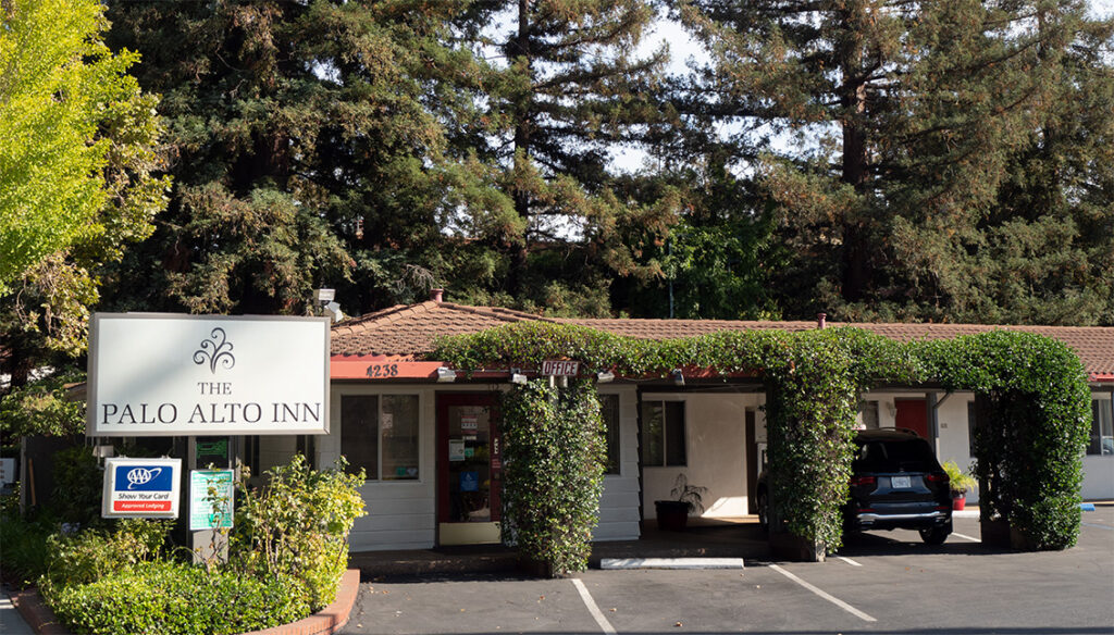 El Camino Real North Su Zhe Palo Alto Redwood – from location down driveway which wraps back behind our 4260 El Camino Real Palo Alto Inn Sky Ranch Montessori Avis Hobees Hilton Garden Inn Americas Tire McLaren Volvo